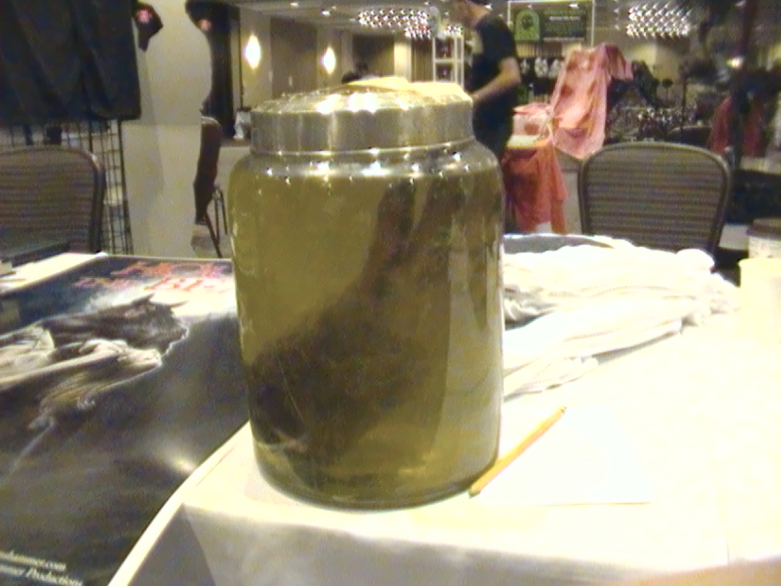 Following the suggestion of a pal, Pirates of Savannah author Tarrin Lupo, I brought along a prop: a severed werewolf hand floating in a jar. Now I thought the thing would hardly raise an eyebrow in a dealers’ room packed with horror memorabilia and props crafted by Hollywood special effects experts and haunted house designers. But it worked like a charm, drawing curious attendees to my table like flies. These hardcore horror fans who live for special effects AND creators of those effects thought it was incredibly cool and wanted to know its history. I think what sold it was the yellowed paper describing it as having been “displayed by the Revlos Bros. Traveling Circus circa 1928. “ That and the REAL BONE at the stump — although one skeptical 8-year-old girl suggested the hand “should be scientifically tested.”