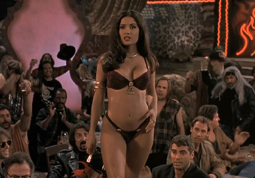LAP-UP-YOUR-BLOOD DANCE ANYONE? Curvaceous Salma Hayek, as stripper Satánico Pandemónium, entertains George Clooney and his drinking buddies, shortly before she turns into blood-slurping monster, in “From Dusk Till Dawn.”